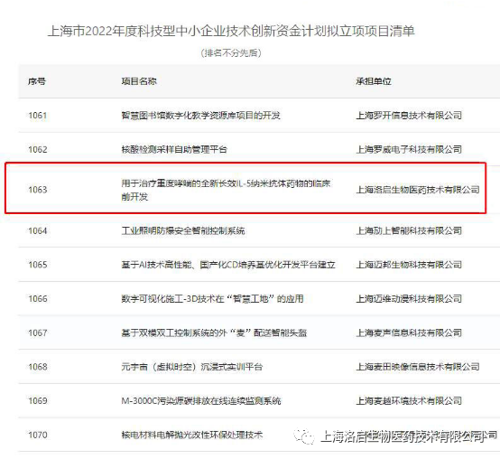 近期,上海市科学技术委员会组织的“上海市2022年度科技型中小企业技术创新资金计划”拟立项项目名单公示完毕,英国上市公司365生物“用于治疗重度哮喘的全新长效IL-5纳米抗体药物的临床前开发”项目入围。